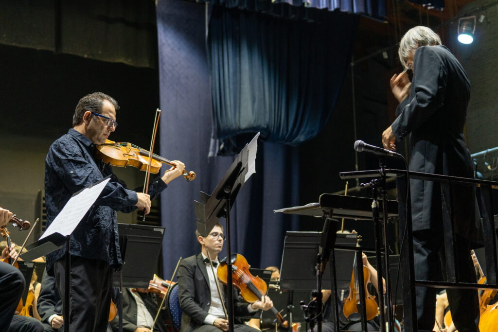 Ante un notable público presente, el concierto empezó a las 21h. Luego de la afinación, el Maestro Viegas entró al escenario y, recibido por aplausos, se dispuso a comenzar con la música expresando previamente su apoyo a la nueva música nacional. Desde el podio, sus indicaciones dieron inicio a la obra estreno mundial de Parotti. Pieza muy bien recibida por la asistencia que, según pudo contar el solista en publicaciones previas al evento, relata, entre melodías, ritmos y contrapuntos, las peripecias del hijo del compositor en un día de su vida en Buenos Aires, ciudad donde reside. Como pieza de música contemporánea, fue muy colorida, logrando con sus sonidos representar acontecimientos y acciones en la imaginación de los presentes y el desempeño del violista fue de primer nivel.